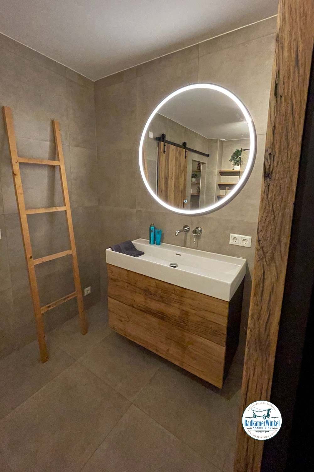Deze klant heeft gekozen om goudtinten, marmer en betonlook taupe in haar badkamer te verwerken. Daarbij heeft ze gekozen voor een Scrapwood meubelkast, badkamermeubel en plankjes om het luxe gevoel compleet te maken.