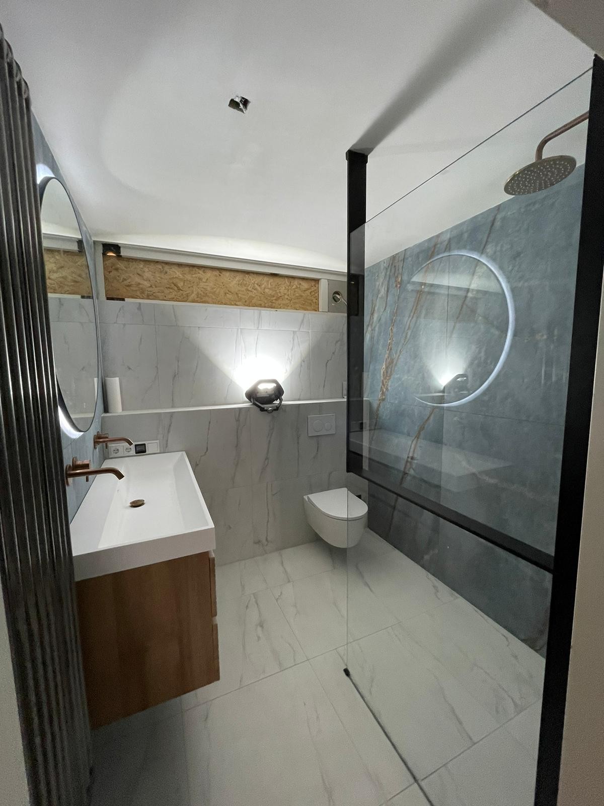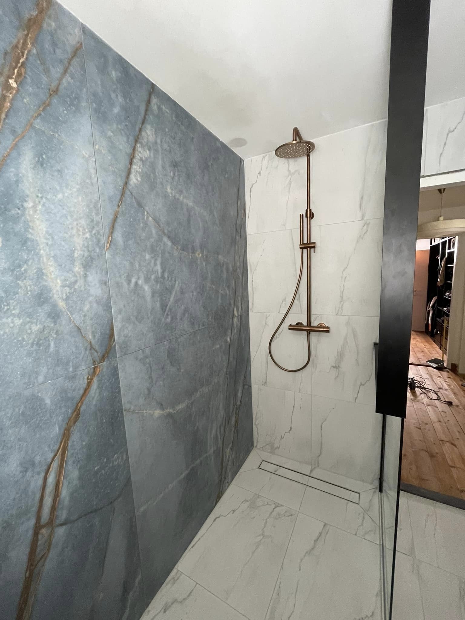 Deze nieuwbouw badkamer is gerealiseerd in Eindhoven. De eigenaren hebben gekozen voor een blauw met goud tint marmer in combinatie met een witte marmeren tegel. Omdat er een goud tint in de blauwe tegel zit, hebben ze gekozen voor goude kraantjes. De wasbak en wc zijn wit. Wat overigs een mooie combinatie is omdat goud en wit terug komen in de tegels.